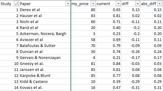 Festinger & Carlsmith (1959): In this classic study of cognitive dissonance, participants given a small bribe to say a boring task was fun changed their opinion of the boring task. Unfortunately, the published results contain a number of GRIM errors.